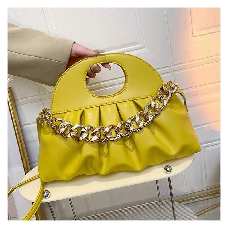Elevate your style with this famous handbag featuring a thick chain handle and pleated design. Perfect as a crossbody bag or clutch purse, it comes with a long belt for added versatility.