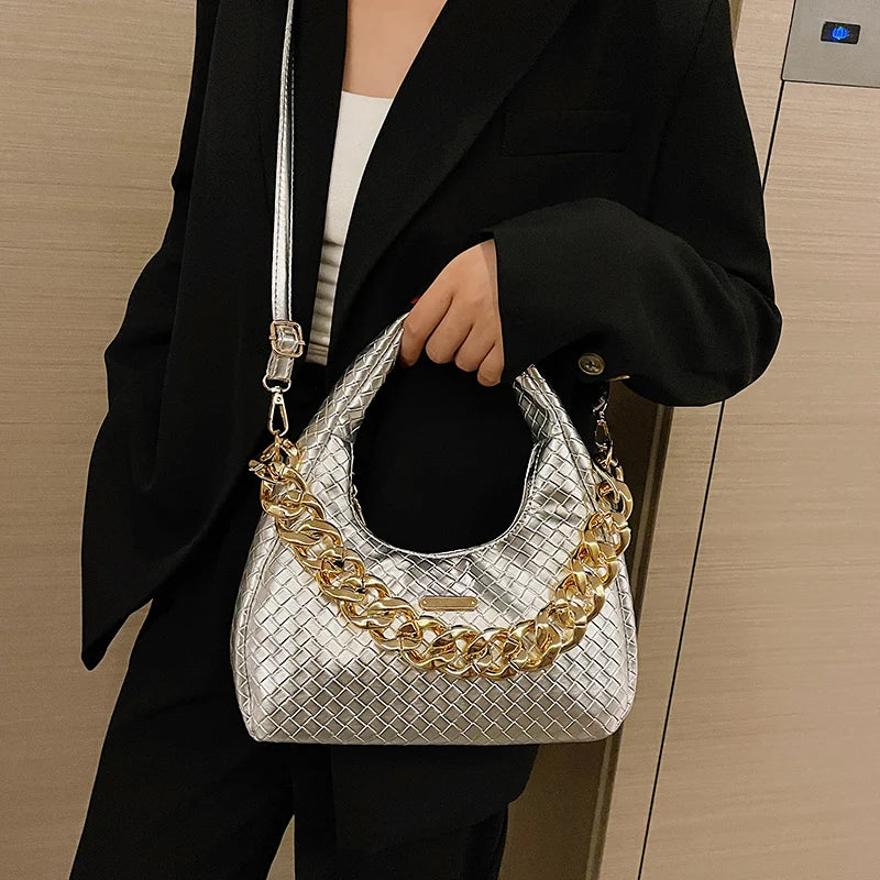 Elevate your style with this trendy shoulder bag featuring a thick chain strap and textured PU leather material. Perfect for a night out or everyday use.