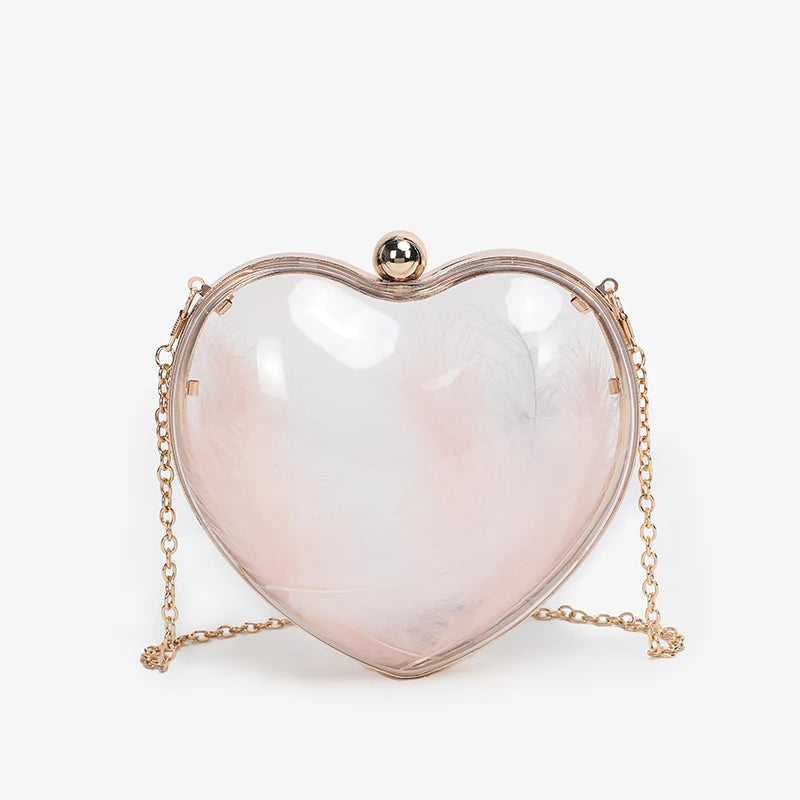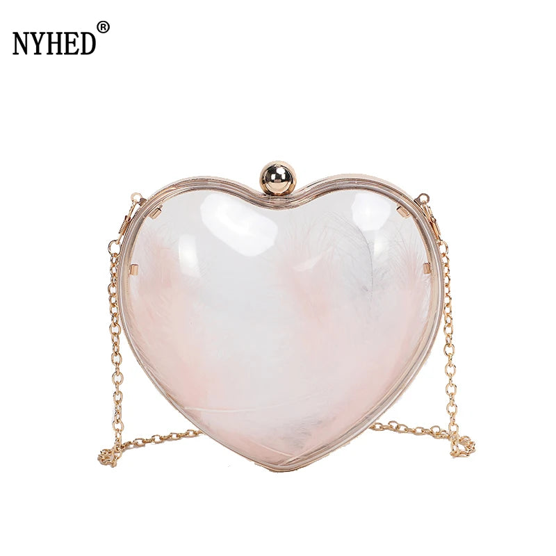 This women's transparent handbag is a stylish gift for your wife. It features a heart-shaped box clutch design with chains for a trendy look.