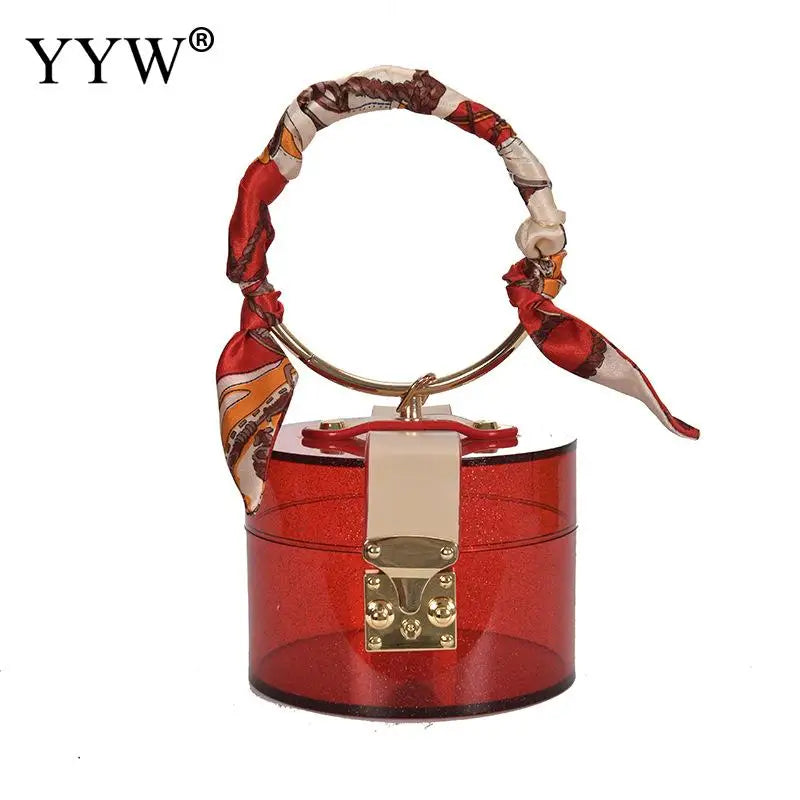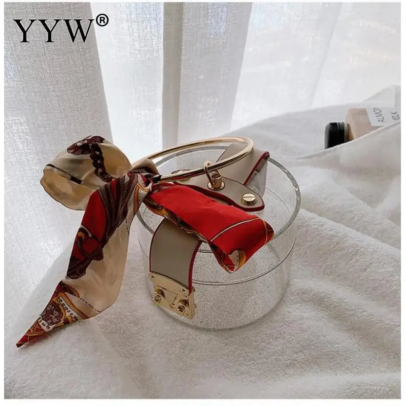 This stylish handbag features a transparent design with a plastic ring handle, perfect for parties or evenings out. It can also be used as a shoulder bag, purse, scarf bag, or tote bag.