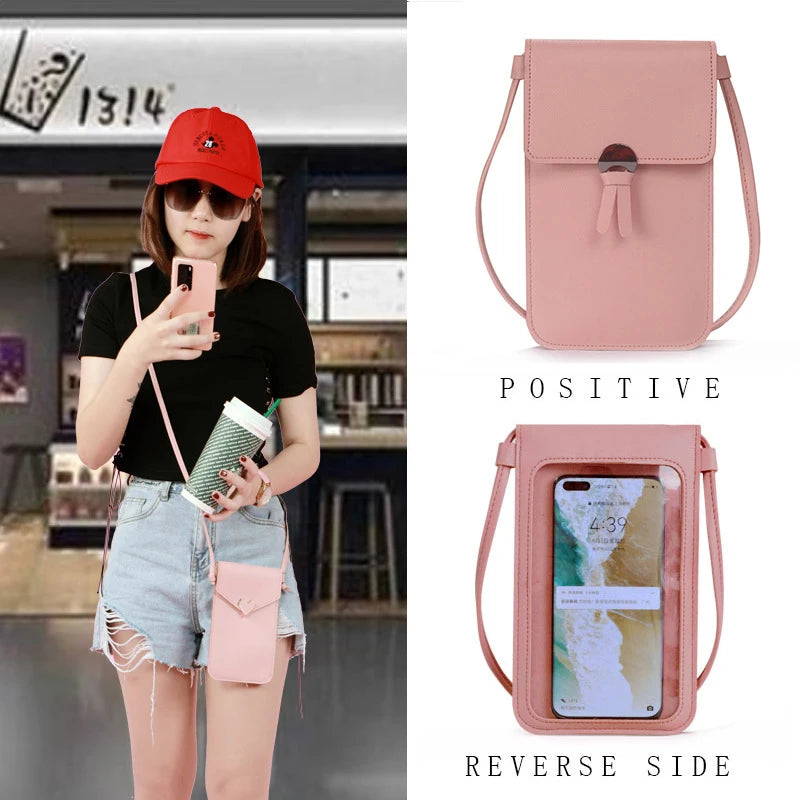 Stay stylish with this transparent touch screen retro mobile phone bag made of high-quality PU material. It features a chain strap for easy carrying.