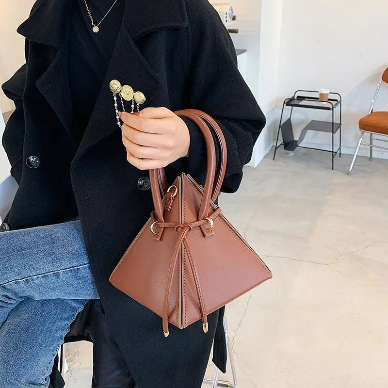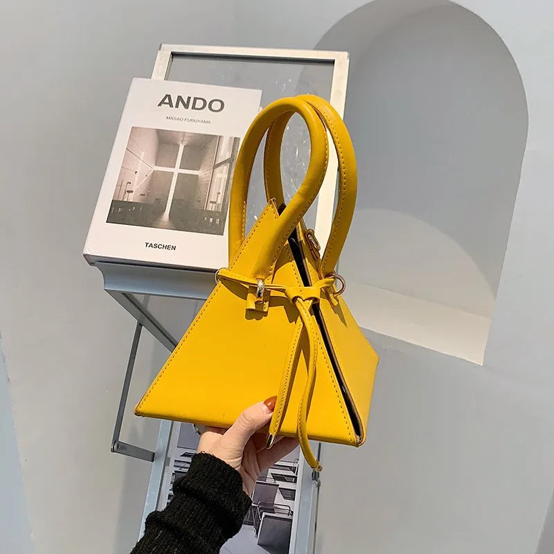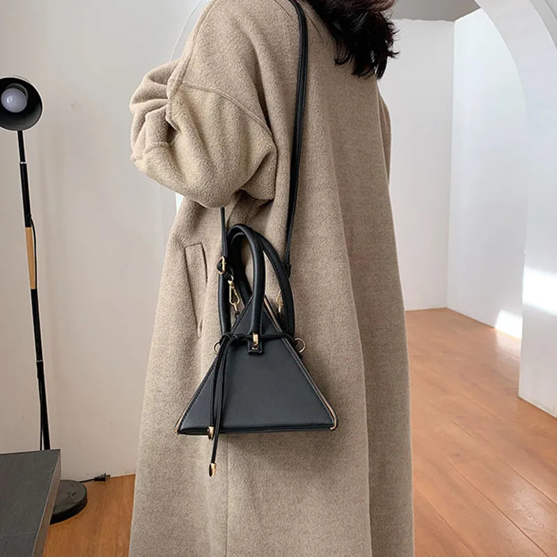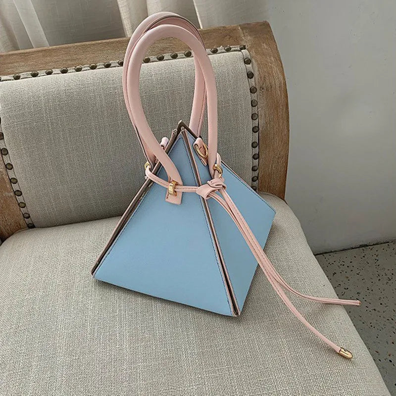 This stylish bag features a three-dimensional triangle design with solid color splicing. Made of high-quality PU leather, it's perfect for everyday use.