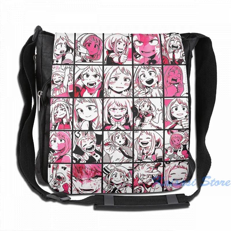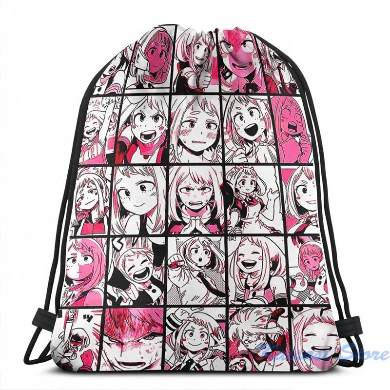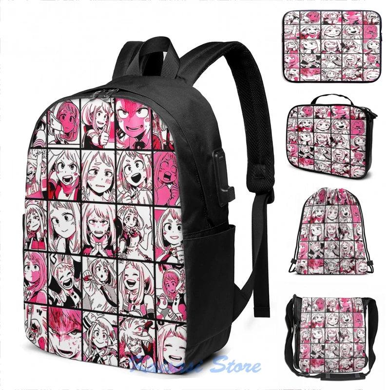 This backpack features a funny graphic print of Uraraka Ochako collage design, suitable for men and women. It has a USB charging port for convenience during travel, school, or work.