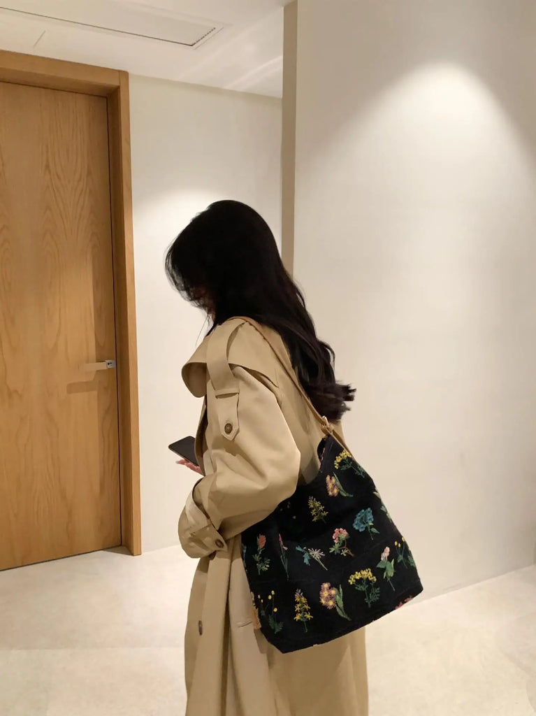 Velvet Flower Printed Tote Messenger Bag Large Capacity Handbag