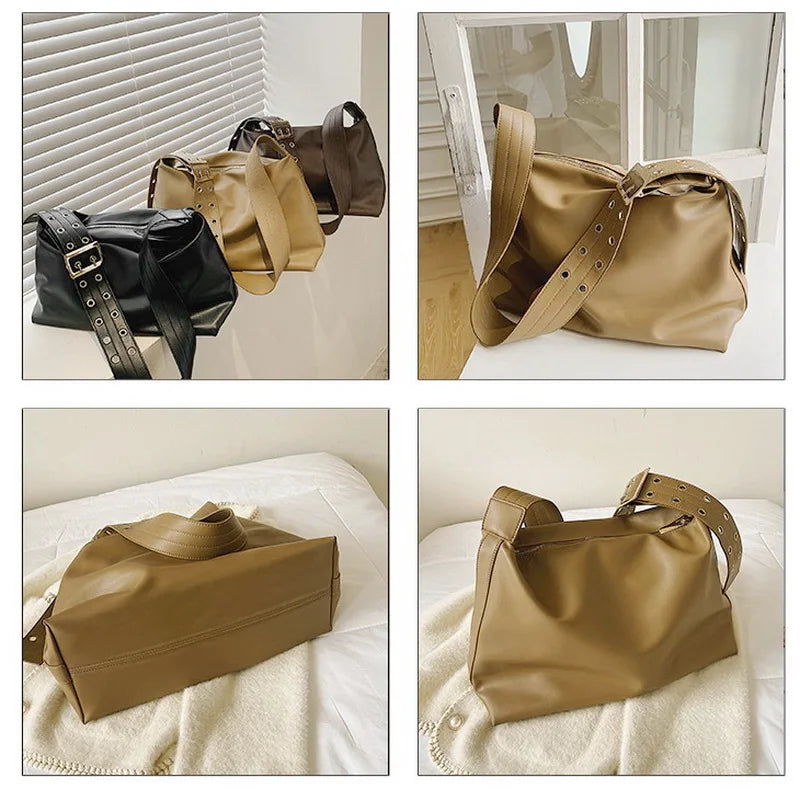 This retro bucket bag for women features a wide belt design and is made of high-quality PU leather. It has a large capacity and can be used as an underarm bag or shoulder bag.