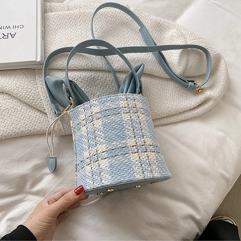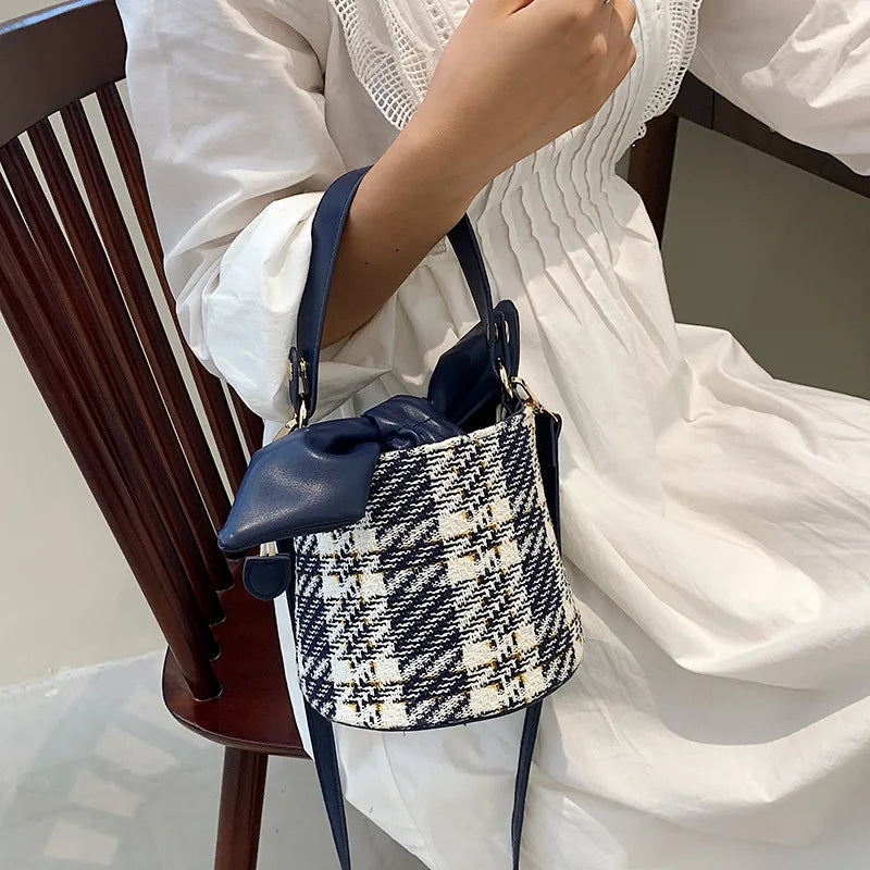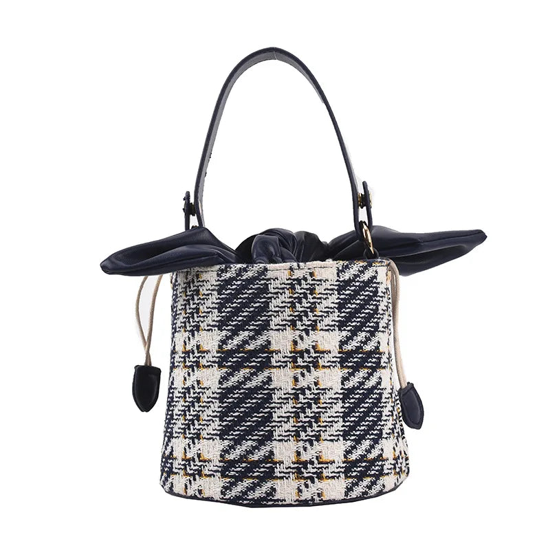Vintage Check Drawstring Bucket Bag Winter Women's Woolen Cloth Shoulder Bag