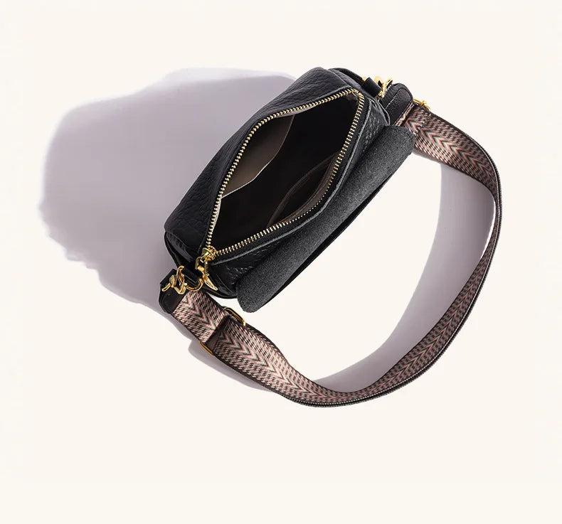This stylish shoulder bag is made of premium cowhide leather, perfect for women on the go. It includes a phone wallet for added convenience.