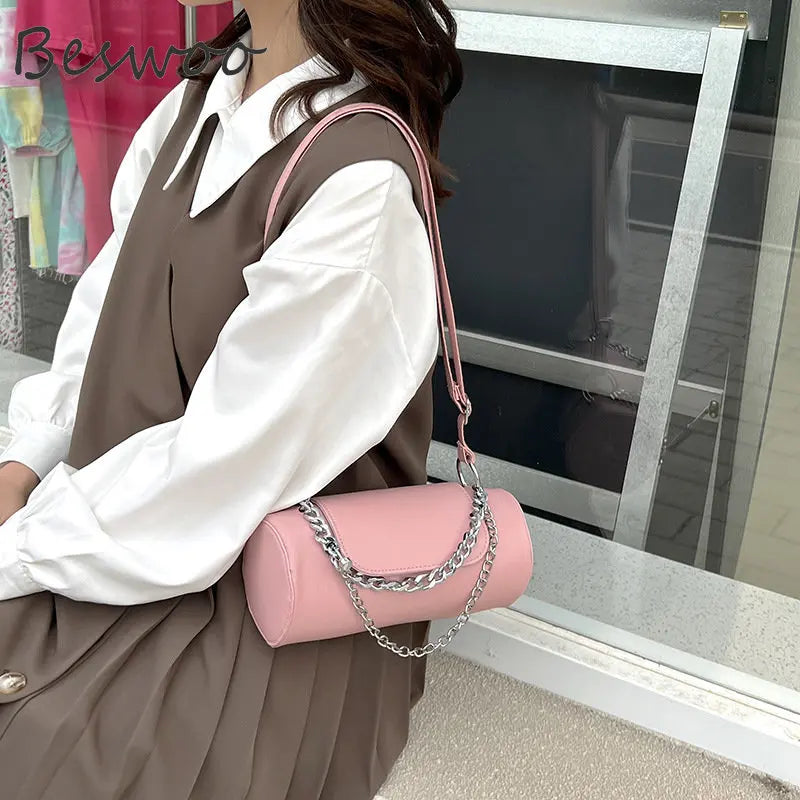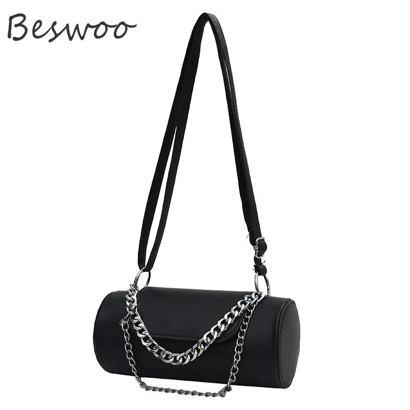 Stay stylish with this autumn vintage crossbody bag featuring a chain shoulder strap. A sleek and versatile barrel shape adds a touch of elegance to any outfit.
