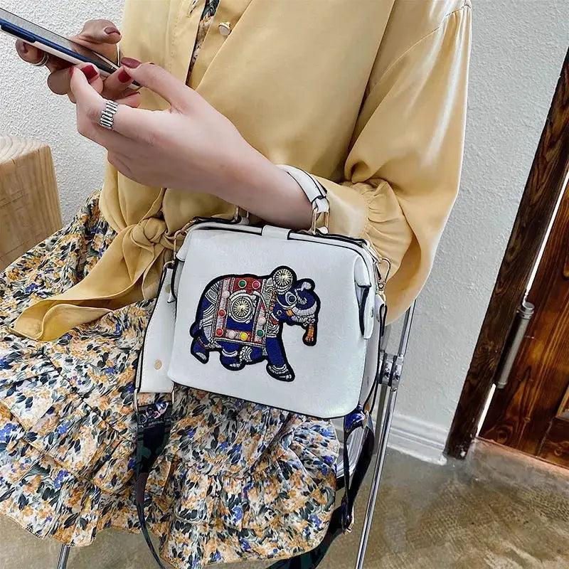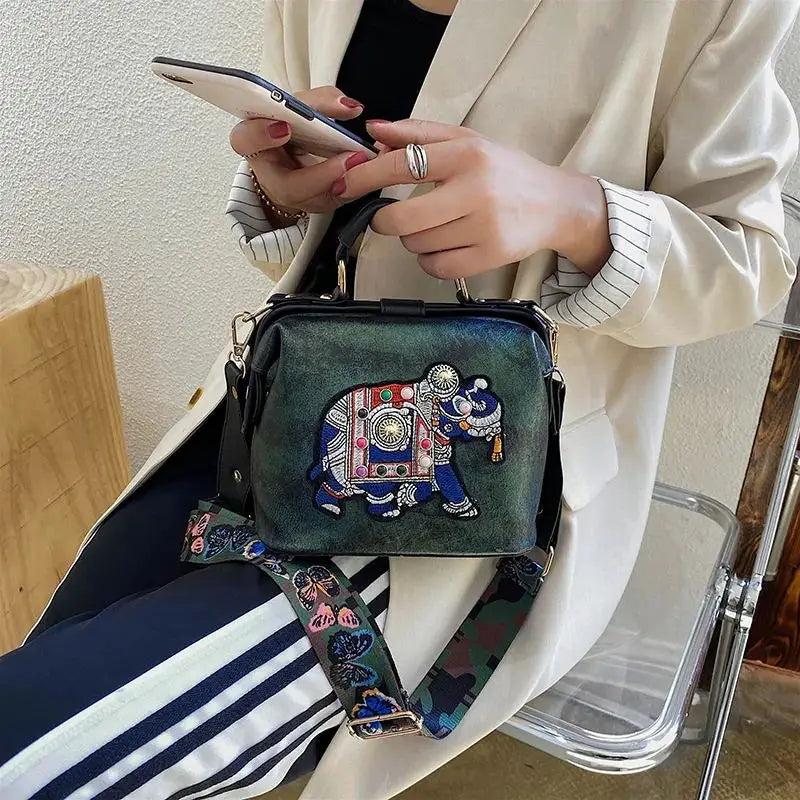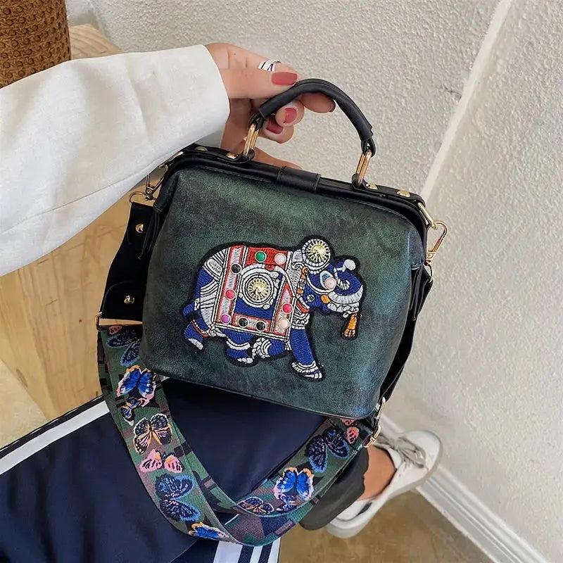 Vintage Embroidery Elephant Handbag Wide Strap Leather Women Shoulder Bag