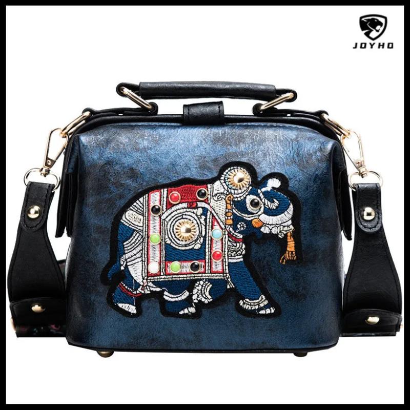 This vintage handbag features intricate elephant embroidery and a wide butterfly strap. It is made of high-quality leather and can be worn as a crossbody bag or tote. Perfect for women who love unique and stylish accessories!