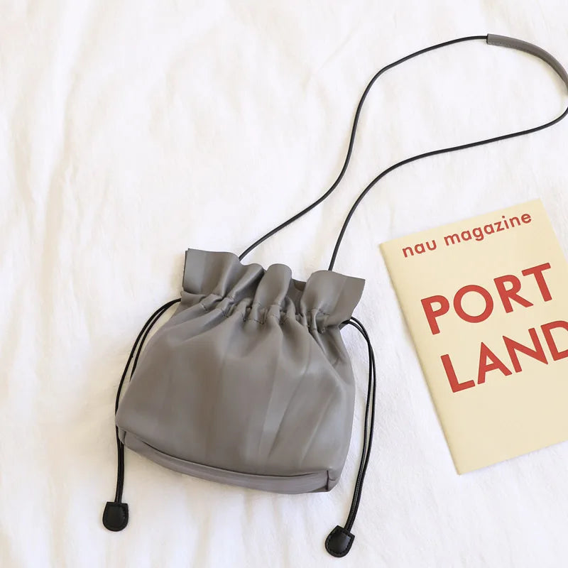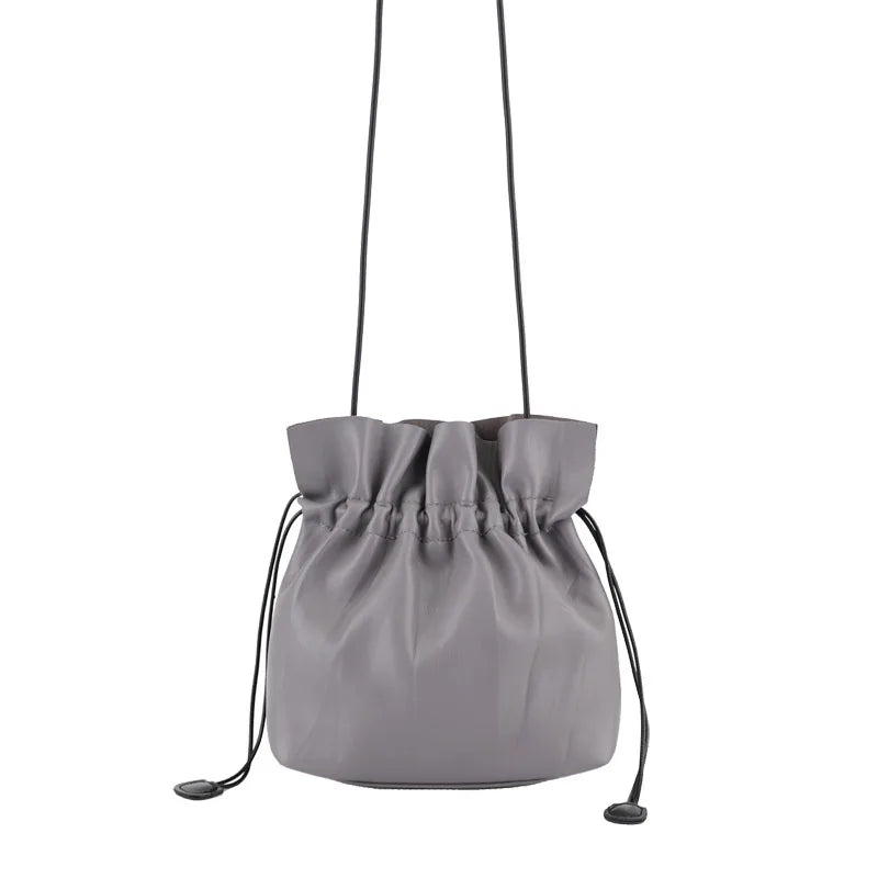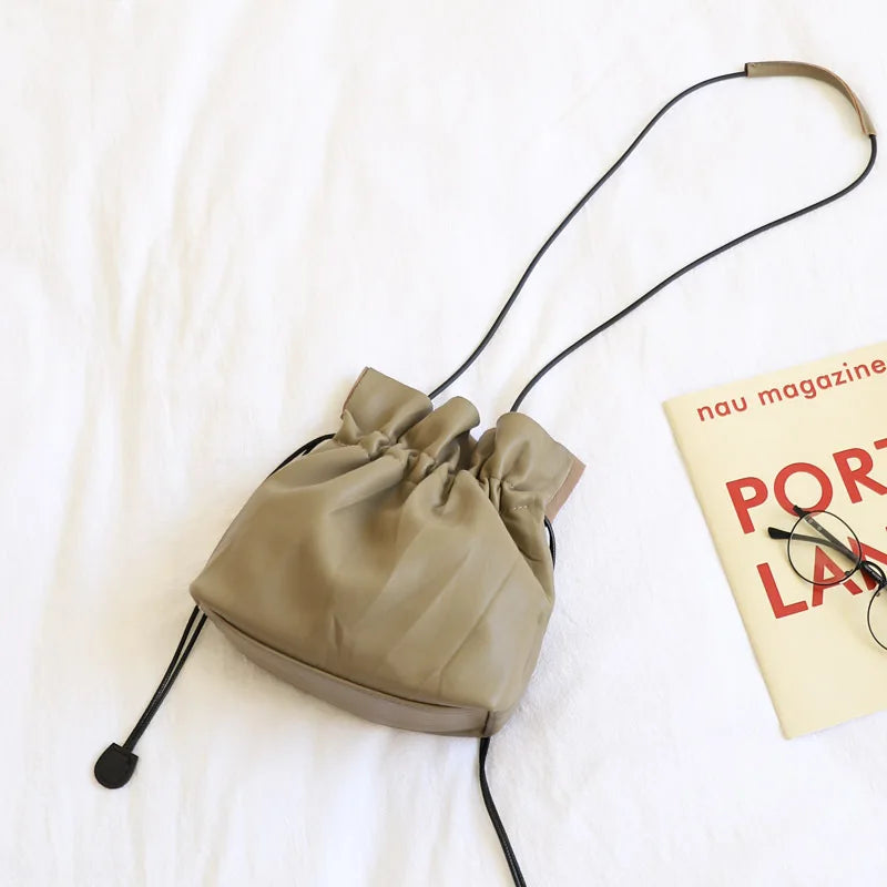 This soft PU bucket bag is perfect for everyday use. It features a draw-string closure and a plain leather design in a stylish green grey color.