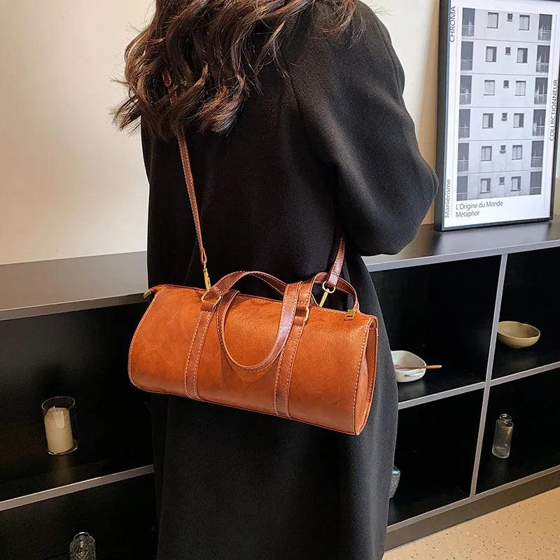 This cylindrical handbag is made of high-quality oil wax leather with a vintage look. It features a diagonal design and a spacious interior pocket.