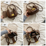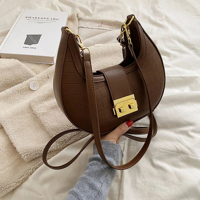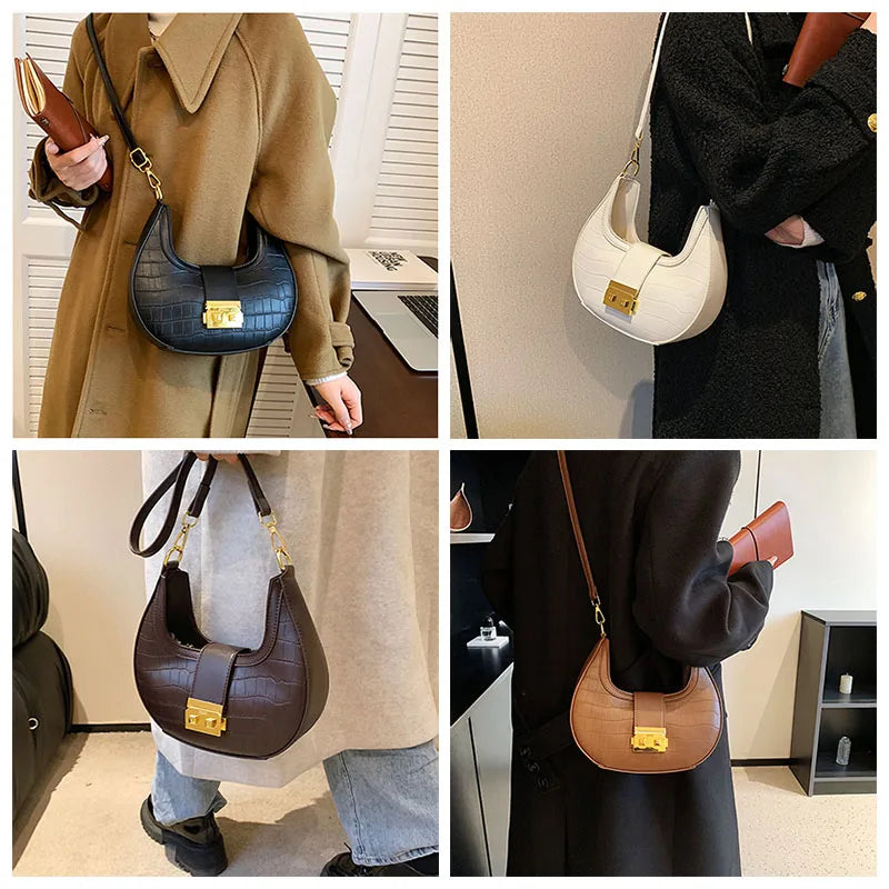 Elegant half moon crescent design handbag made of high-quality PU leather, featuring double zipper closure. Ideal for daily use or special occasions.