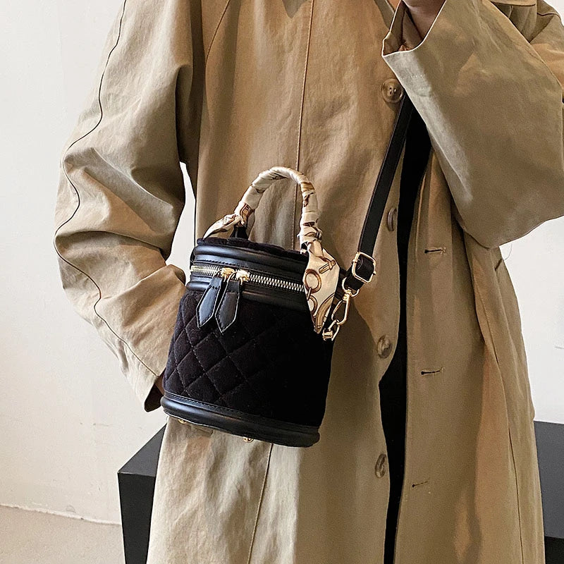 Vintage Quilting Velvet Womens Crossbody Scarf Wrapped Chain Zipper Bucket Bag