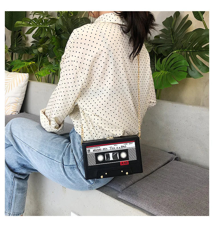 This PU leather bag features a unique vintage radio design, perfect for adding a touch of fun and personality to your outfit. The box chains add a trendy touch to the classic crossbody style.