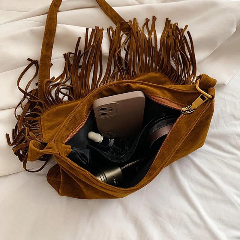 Elevate your style with this vintage bohemian shoulder bag made of suede with intricate fringe tassel details. Perfect for adding a touch of retro charm to your outfit.