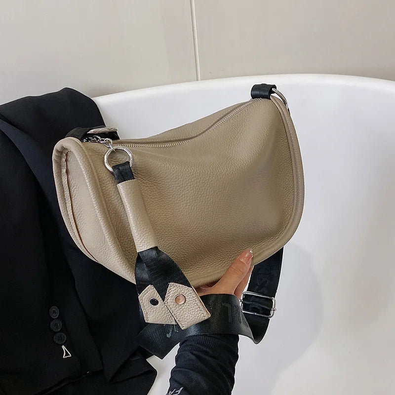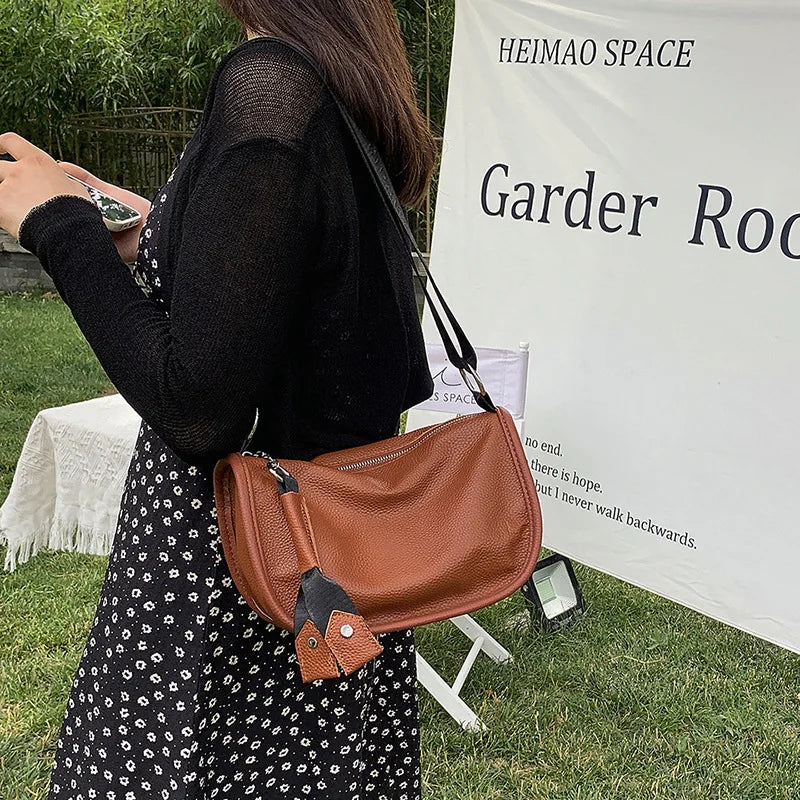This casual sling handbag is made of soft leather with tassel accents. It has a spacious interior and a comfortable shoulder strap for everyday use.