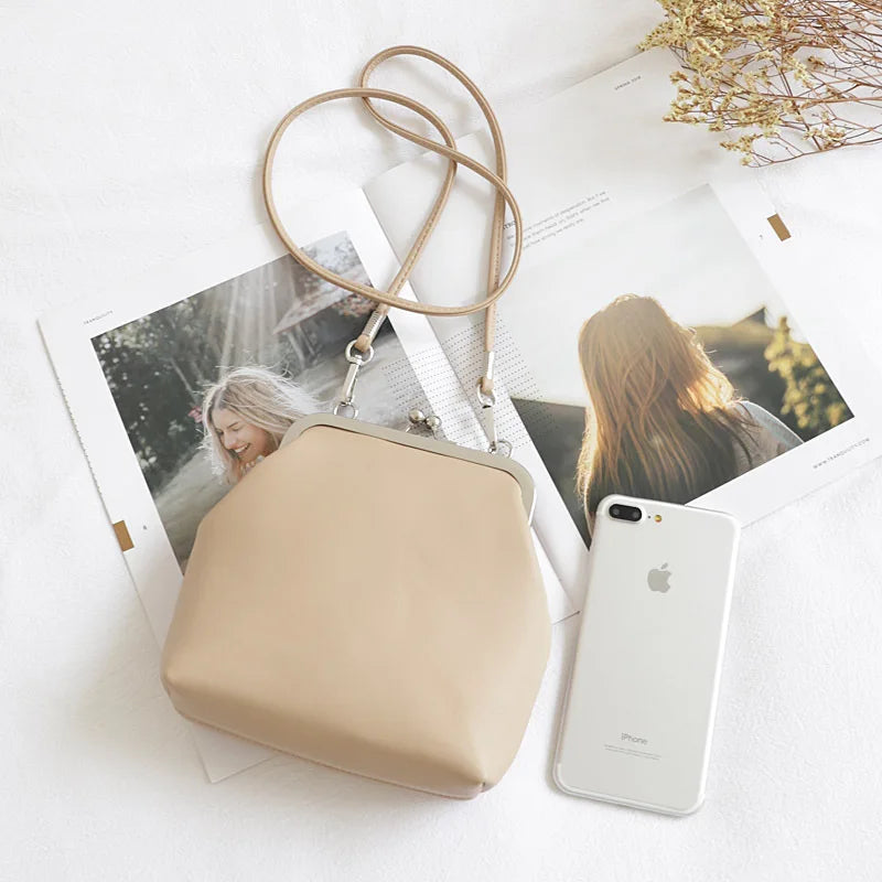 Elegant and chic vintage clip bag made of PU leather. Perfect for carrying phones and essentials. Features a kiss lock closure. Available in various solid colors.