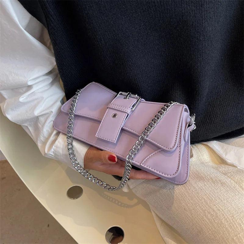 This solid women chain shoulder side bag is made of high-quality PU leather. It features a flap design with a vintage style, perfect for everyday use. The bag includes a detachable shoulder chain for added versatility.