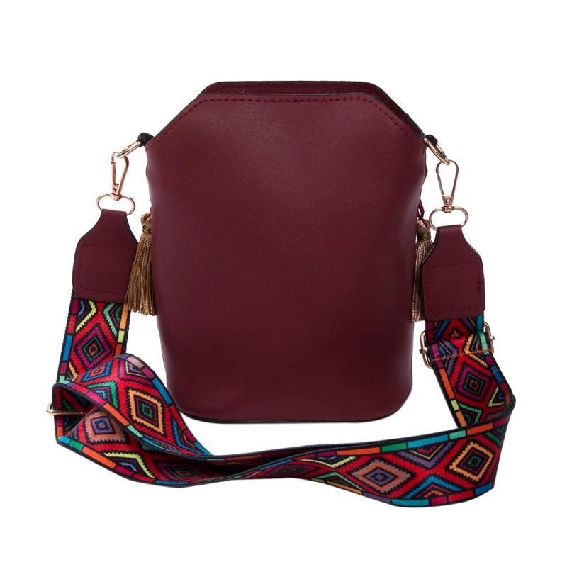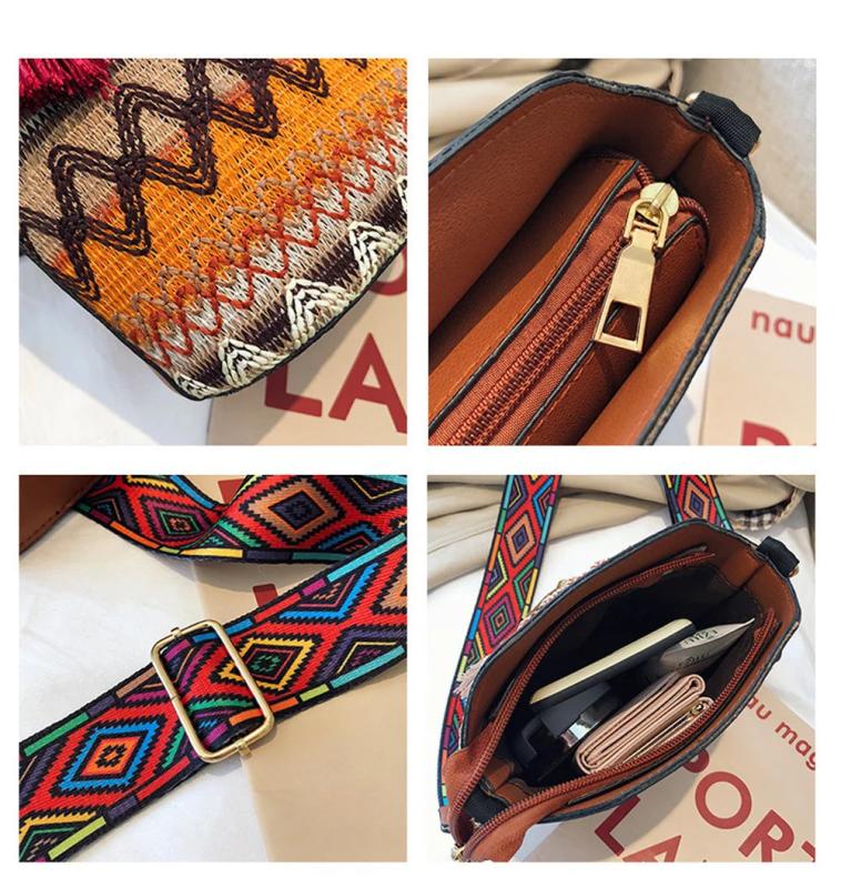 - Handwoven crossbody bag with tassel accents