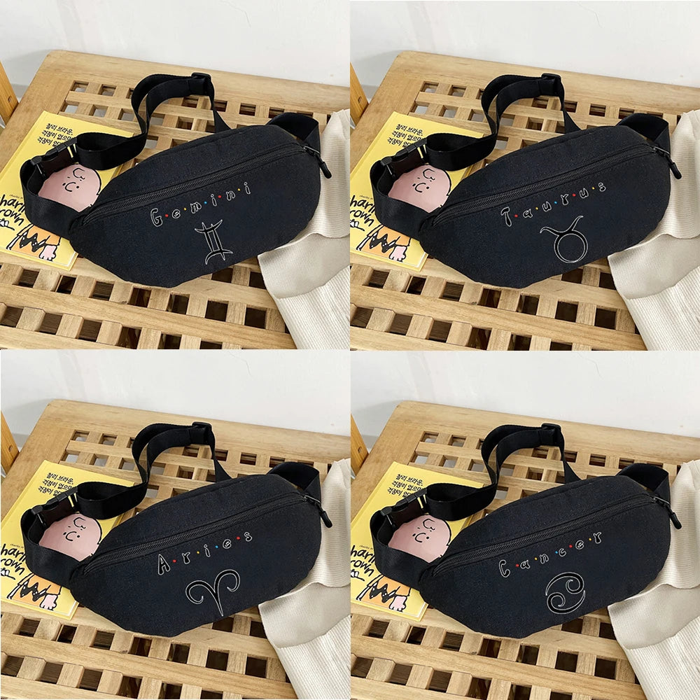 Stay organized on the go with this versatile waist bag that can also be used as a crossbody backpack. Perfect for gym, sports, travel, and more. Features a stylish 12 constellation series design. Made of durable canvas material. Includes shoulder strap for easy carrying.