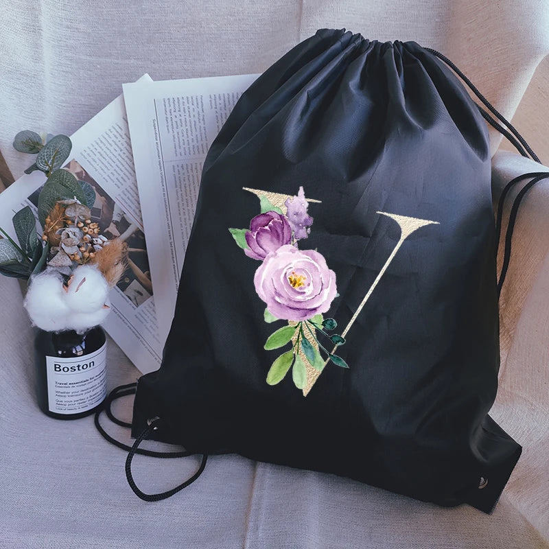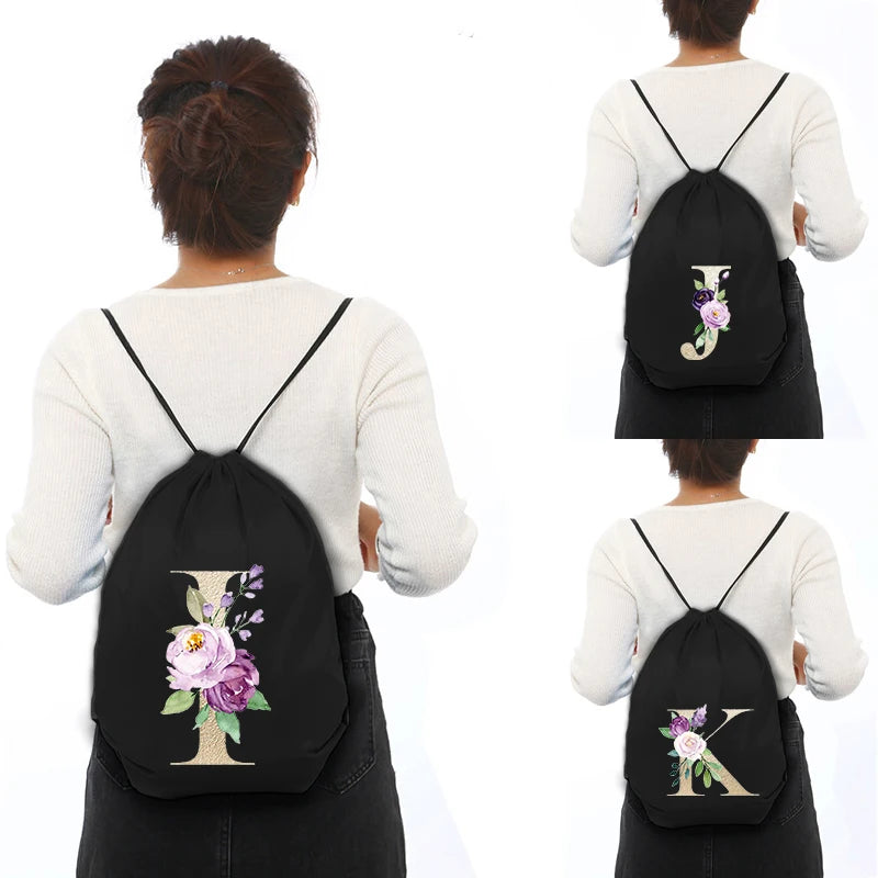 This drawstring bag features a stylish golden letter print and is perfect for both men and women. It is waterproof, foldable, and convenient for various activities such as yoga, travel, or daily use.