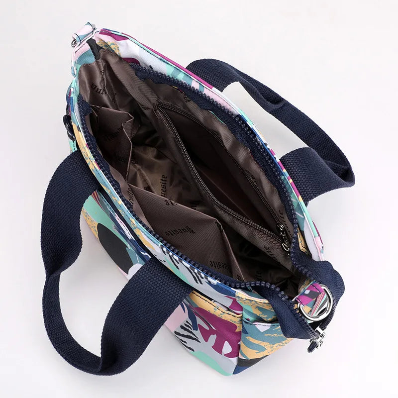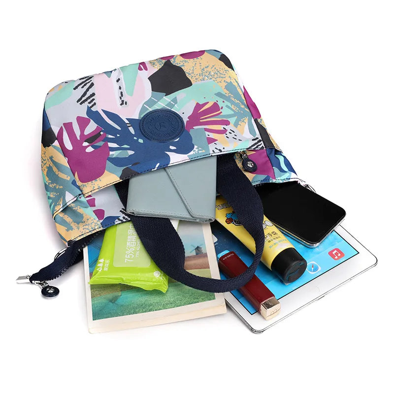 This women's handbag is made of waterproof nylon material, perfect for everyday use. It features a small size with high tote design, ideal for carrying essentials.