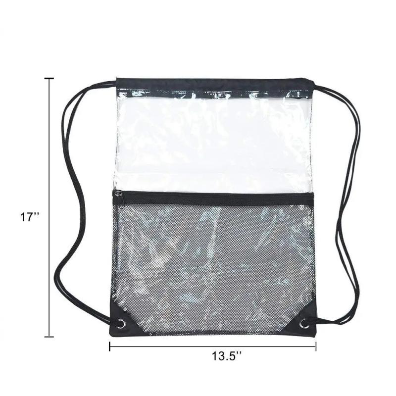 Stay stylish and organized with this transparent clear vinyl drawstring backpack that is waterproof and features a mesh pocket for convenient storage.