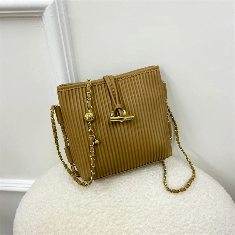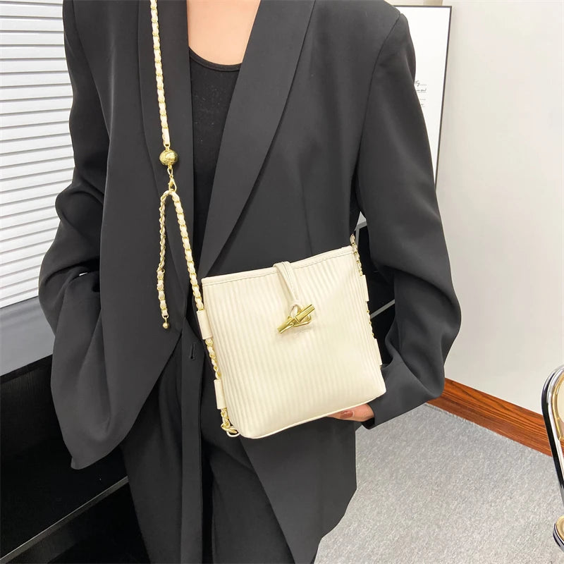 This Western style bucket bag is perfect for women who love fine textures and chains. It's a messenger bag that exudes elegance and sophistication.