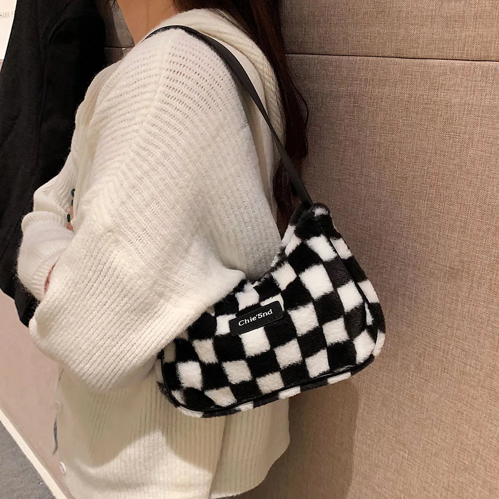 Winter Checker Print Shoulder Bag Women Plush Underarm Bags Casual Female Tote