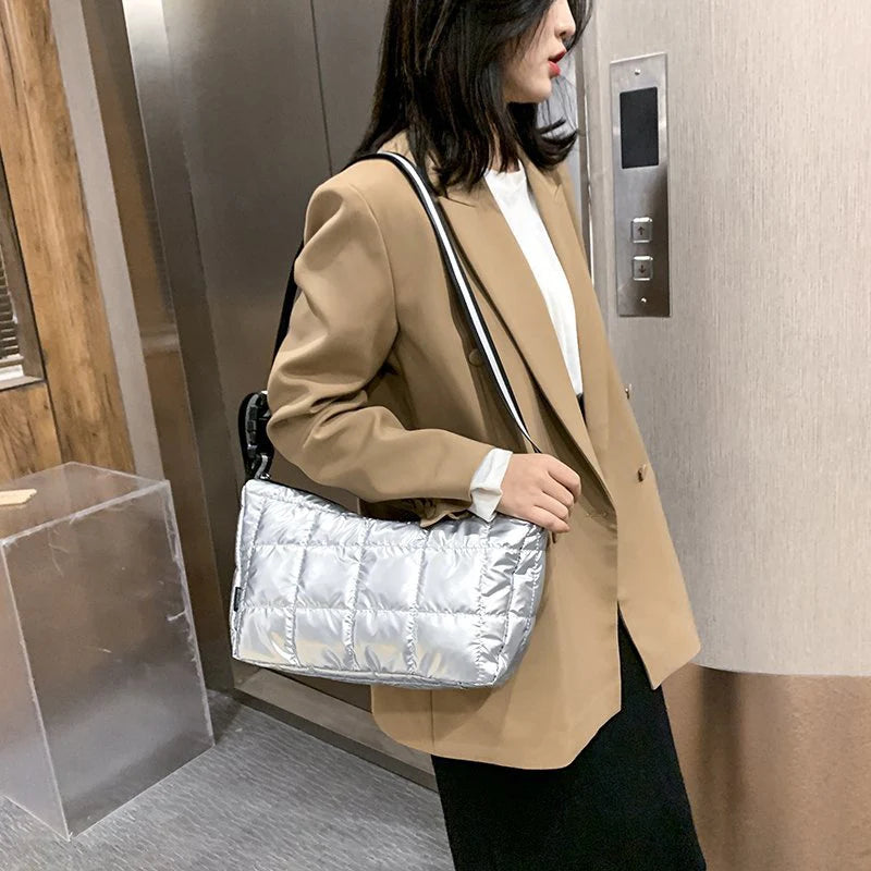Stay stylish and warm with this space cotton shoulder bag that features a down material design. Perfect for all your winter outings!