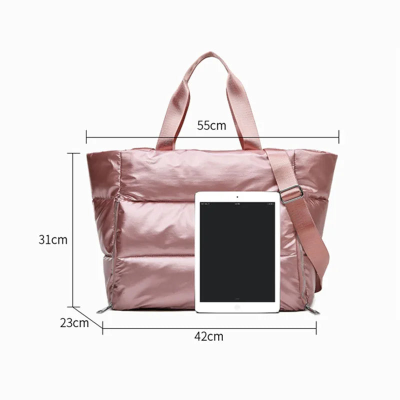 Stay organized and stylish with this spacious shoulder bag made of waterproof nylon. Ideal for sports, gym, or daily use, featuring space pad cotton and feather down material.