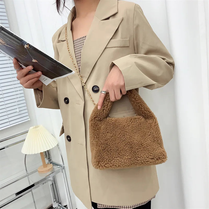 Stay stylish and cozy with this winter plush handbag featuring faux fur design. Perfect for carrying essentials with a touch of elegance.