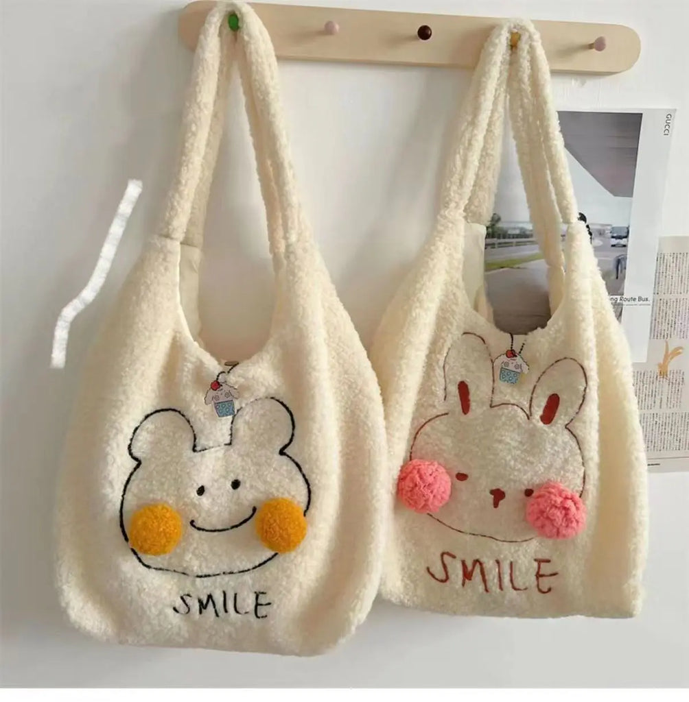 Winter Plush Shoulder Bag Cartoon Embroidery Handbag Large Capacity Shopping Bag