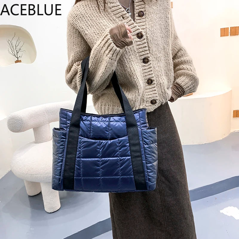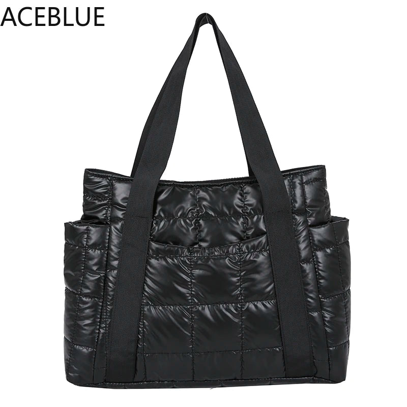 Winter Textured Padded Duffel Bag Plaid Shoulder Bags Nylon Handbags