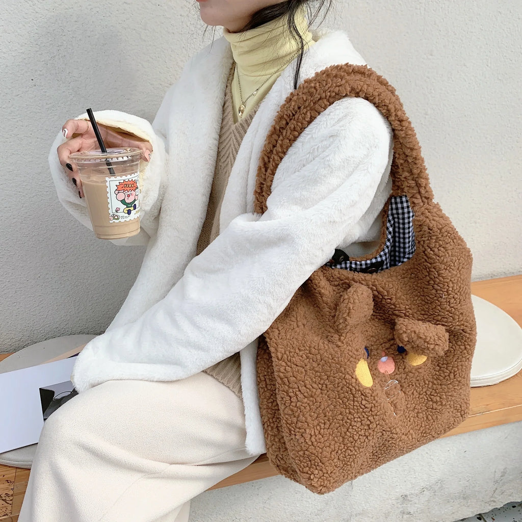 Stay stylish and cozy with this soft lamb hair handbag featuring cute cartoon embroidery. Perfect for winter outings and adding a fun touch to your look.