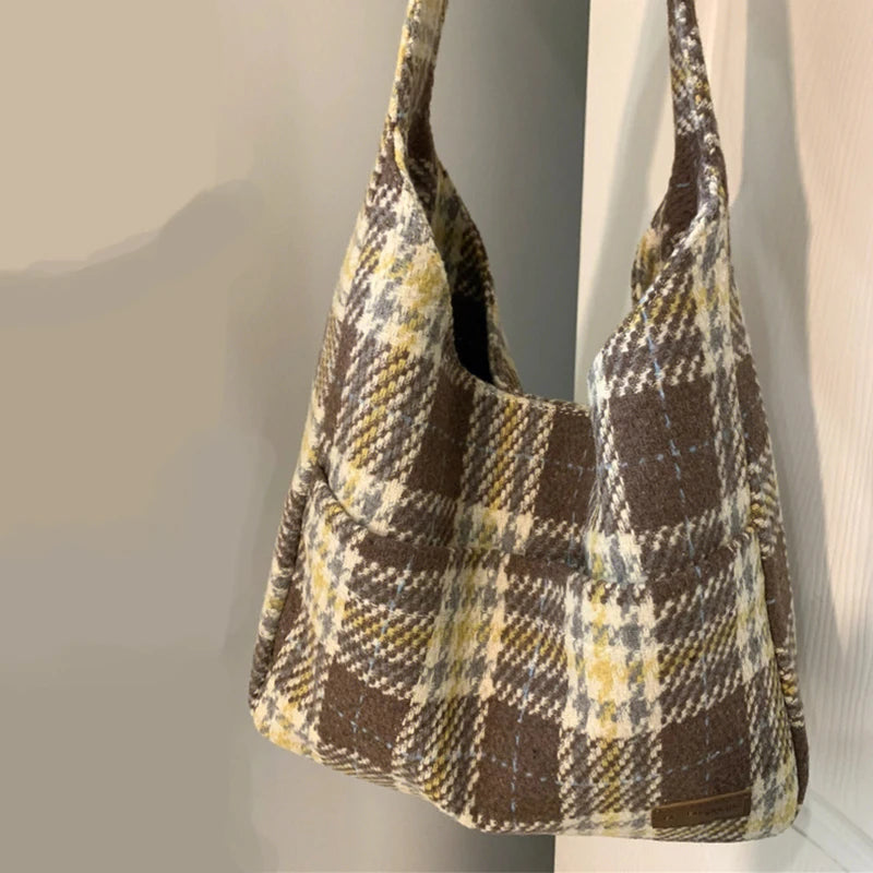 Stay stylish and organized with this versatile shoulder bag. Made of plaid canvas, it has a large capacity for shopping, work, or school.