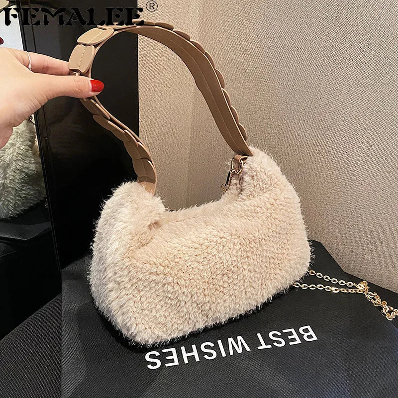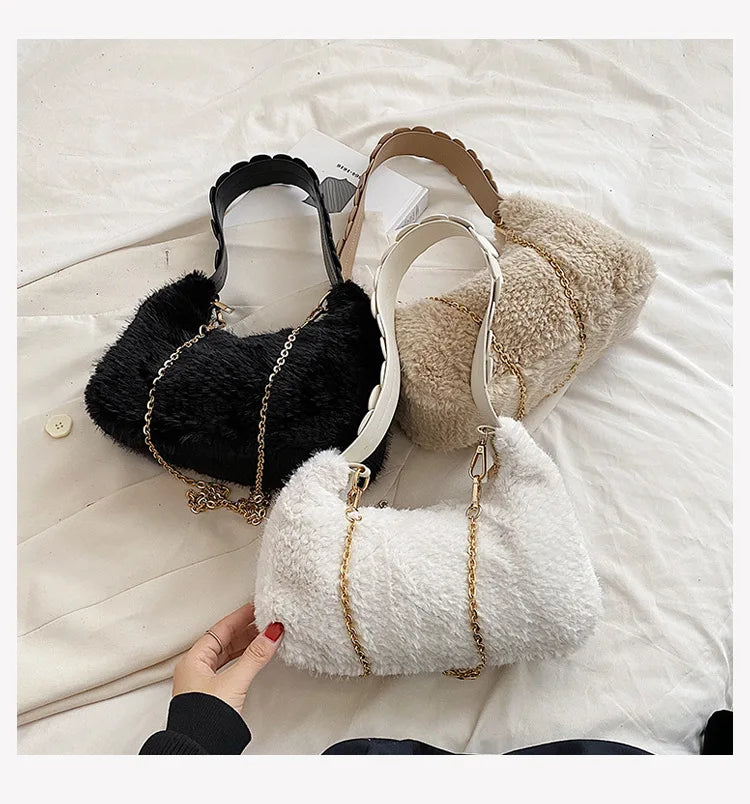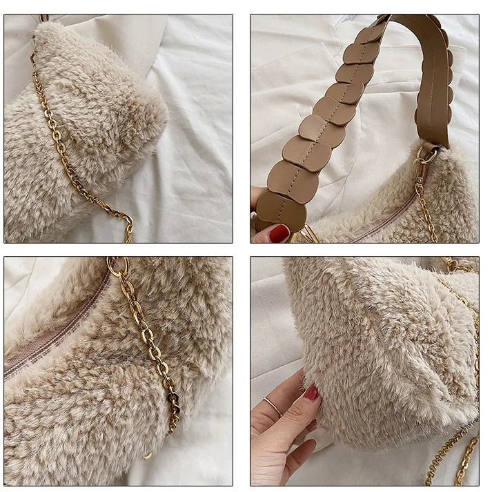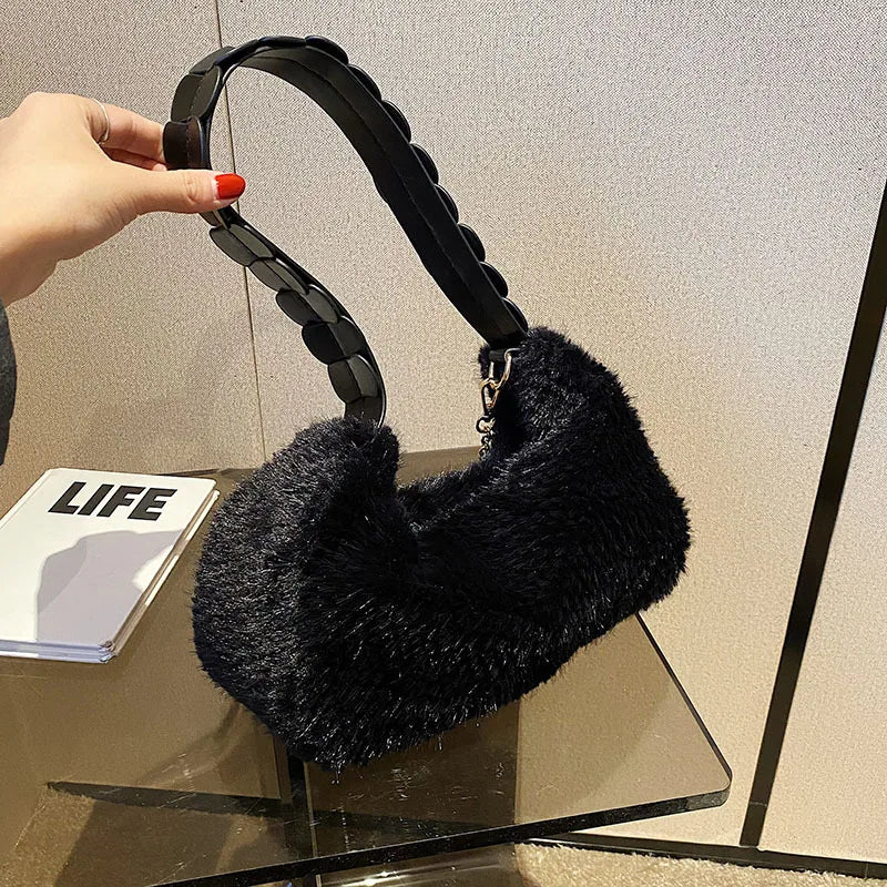 Stay cozy and stylish with this high-quality plush fur handbag designed for winter. This bag features a petal strap and Boston armpit bag design, making it a perfect accessory for the season.
