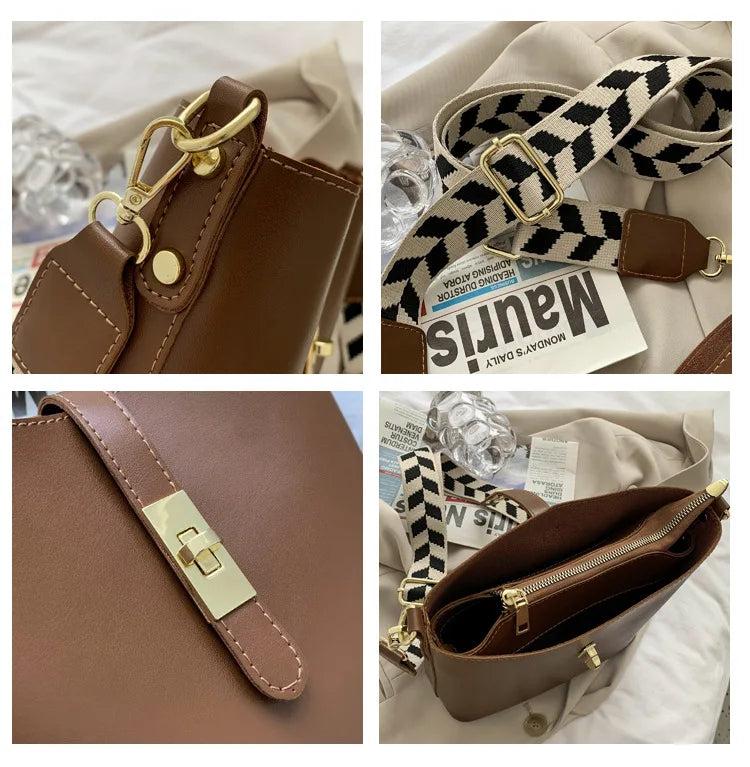 Stay chic and trendy with this bucket bag featuring a fur ball detail and printed shoulder strap. Perfect for travel or everyday use, this bag is spacious and stylish.