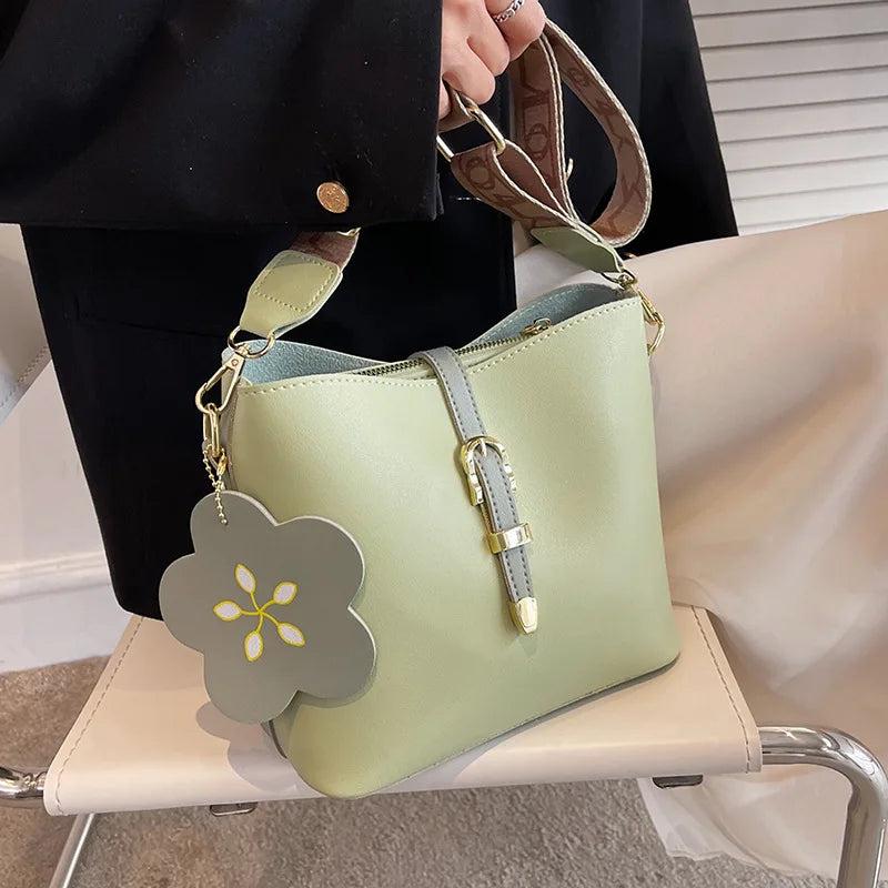 Women Bucket Shoulder Bags Printed Wide Strap Lady Crossbody Bag Green