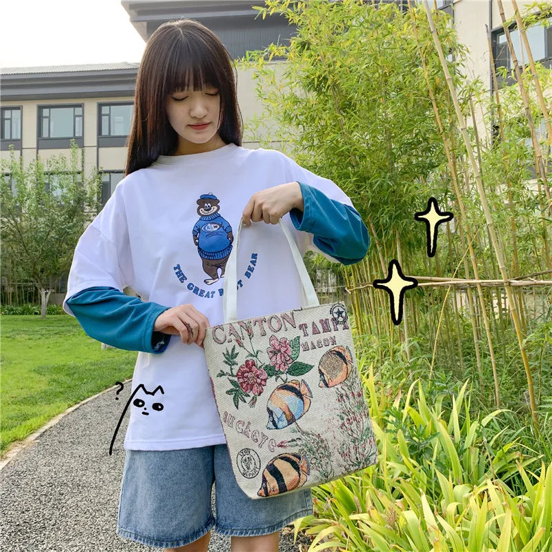 This Harajuku national style tote bag is perfect for daily use. It features a large capacity and is made of durable canvas material.