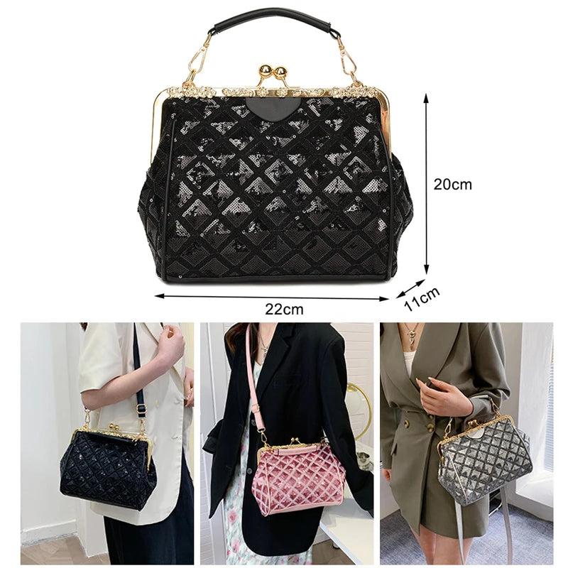This stylish shoulder bag features a diamond lattice sequined design. It can be used as a top handle satchel or a purse, perfect for any occasion.
