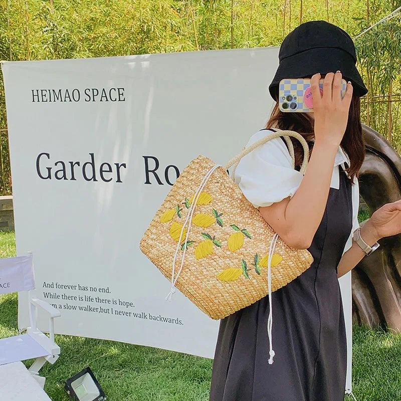Stay stylish with this sweet and casual straw basket bag featuring embroidered lemon design. Perfect for summer beach outings or everyday use.