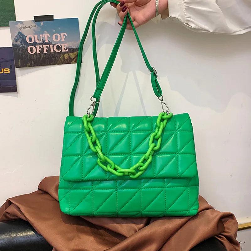 Description:Elegant women's evening clutch with plaid design and thick chain shoulder strap. Available in green, pink, and orange colors.Features: Stylish plaid design Thick chain shoulder strap Ideal for evening events Available in green, pink, and orange Spacious enough for essentials This product may be available in additional colours and sizes....
