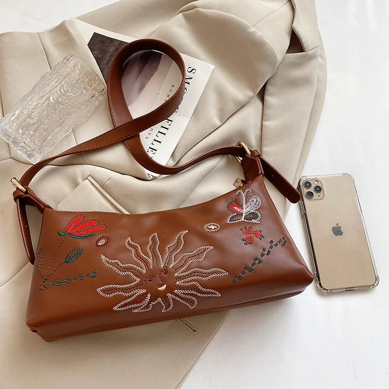 This women's handbag features beautiful flower embroidery and is made of soft PU leather. It can be used as a shoulder bag, crossbody bag, or clutch for your phone and essentials.
