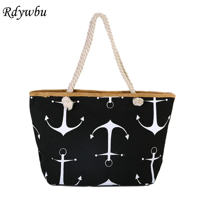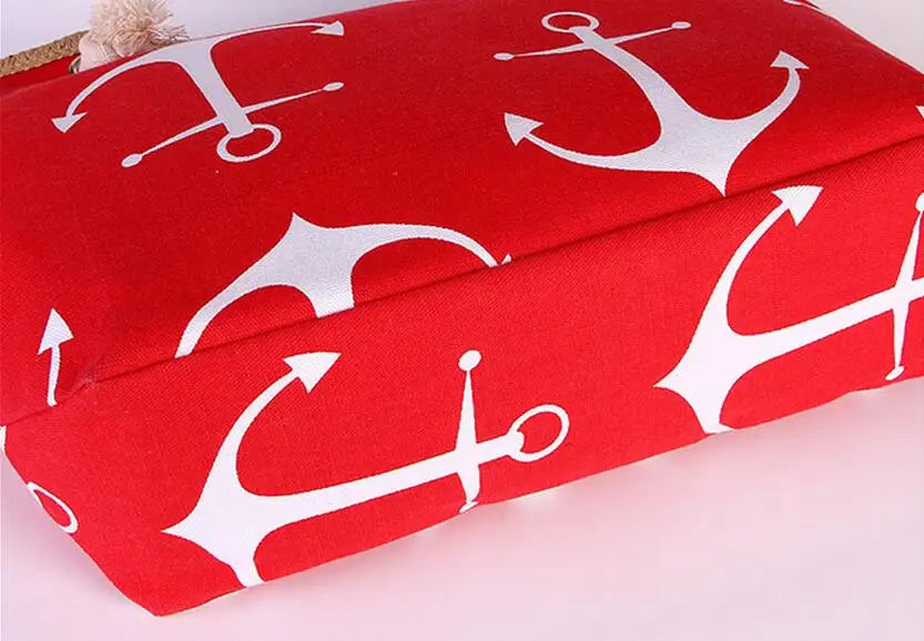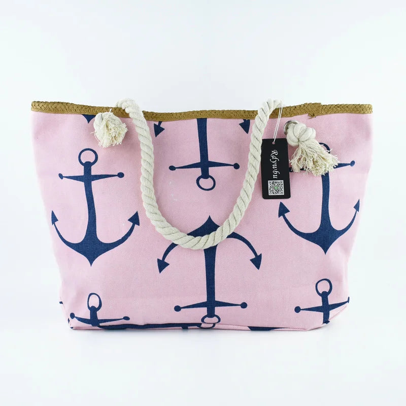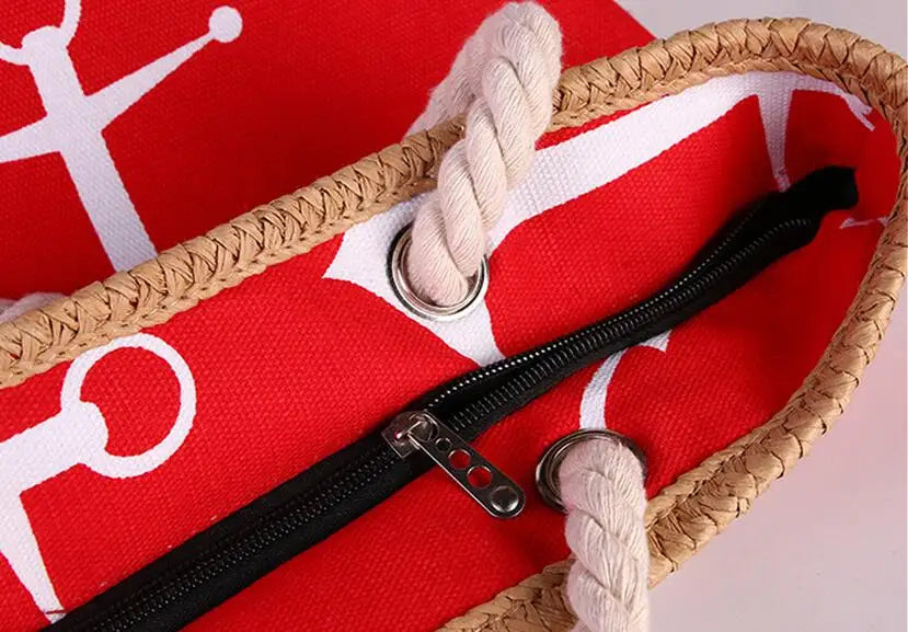 Women Large Capacity Straw Weave Anchor Canvas Beach Tote Bag