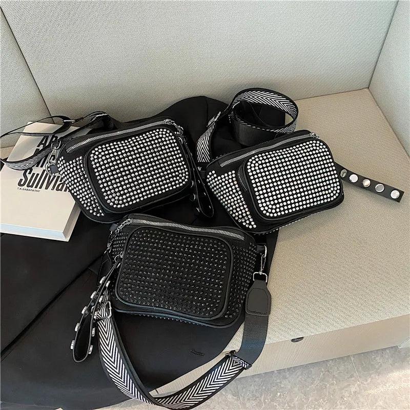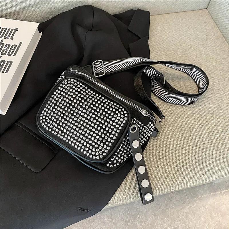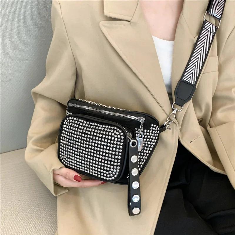 Stylish and practical leather shoulder bag with diamond embellishments, wide strap chest bag design. Perfect for carrying essentials while adding a touch of sparkle to your outfit.