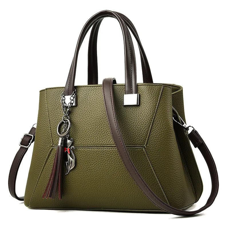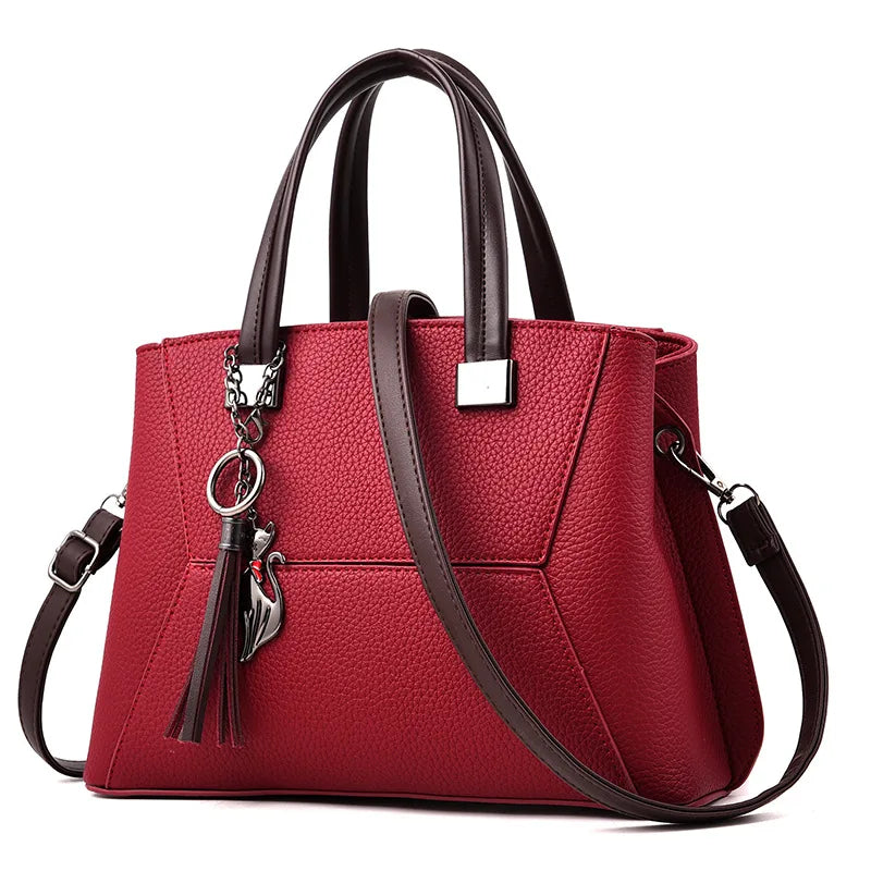 Stay stylish with this large leather handbag featuring tassels and a trunk design. Perfect for everyday use or special occasions.