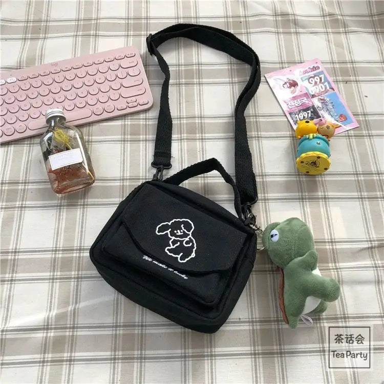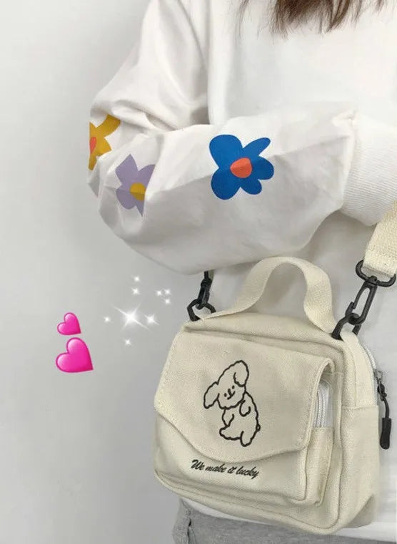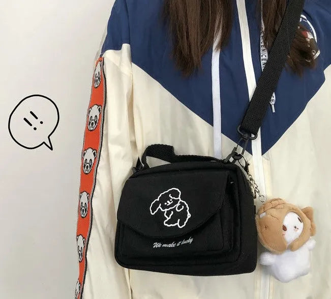 Stay stylish with this sweet cartoon studded messenger bag. Made of durable canvas material, it's perfect for everyday use.