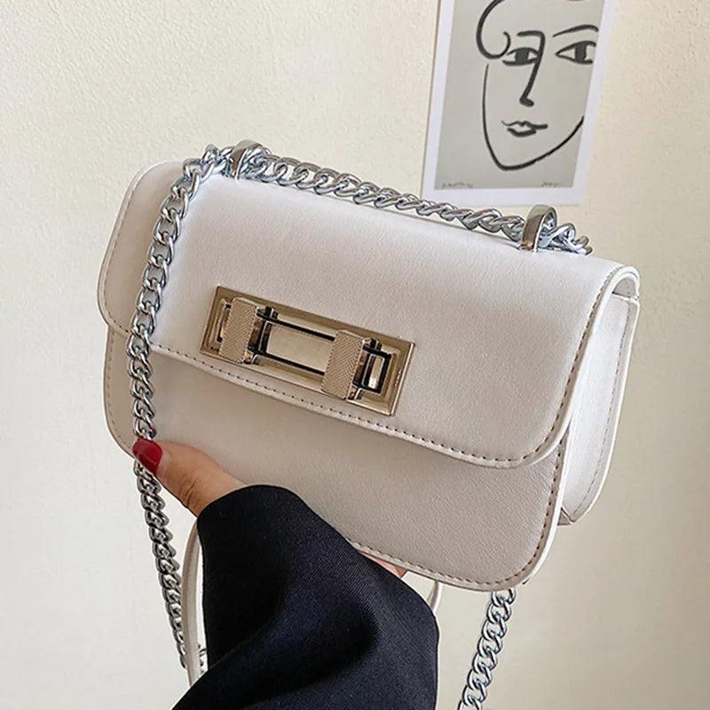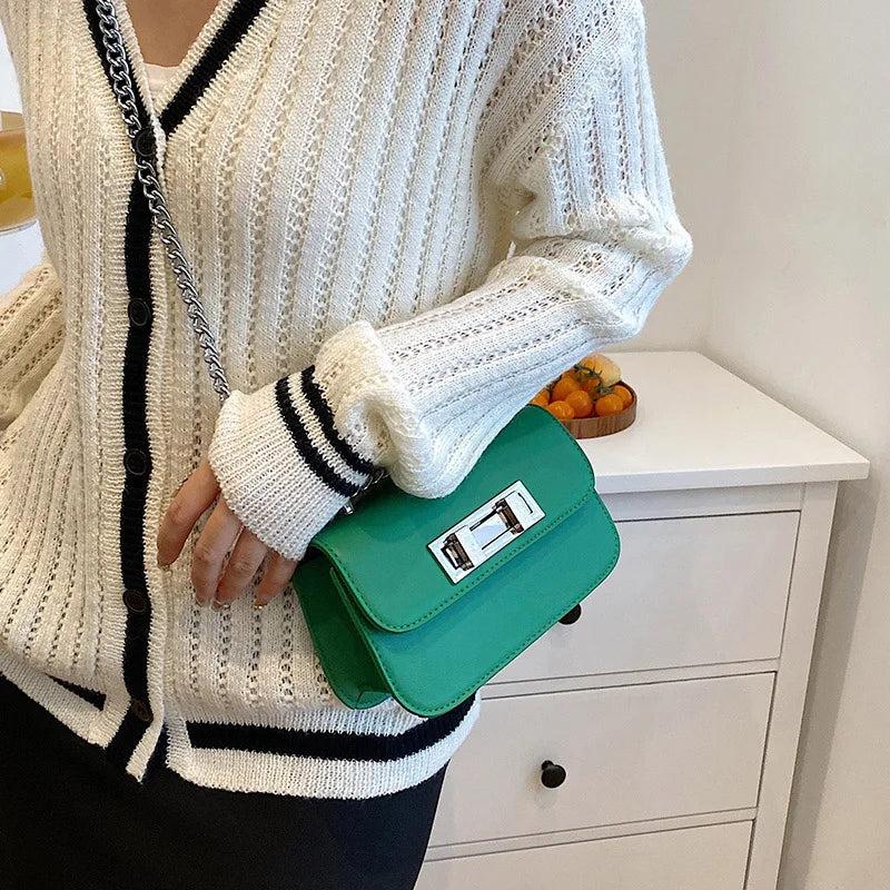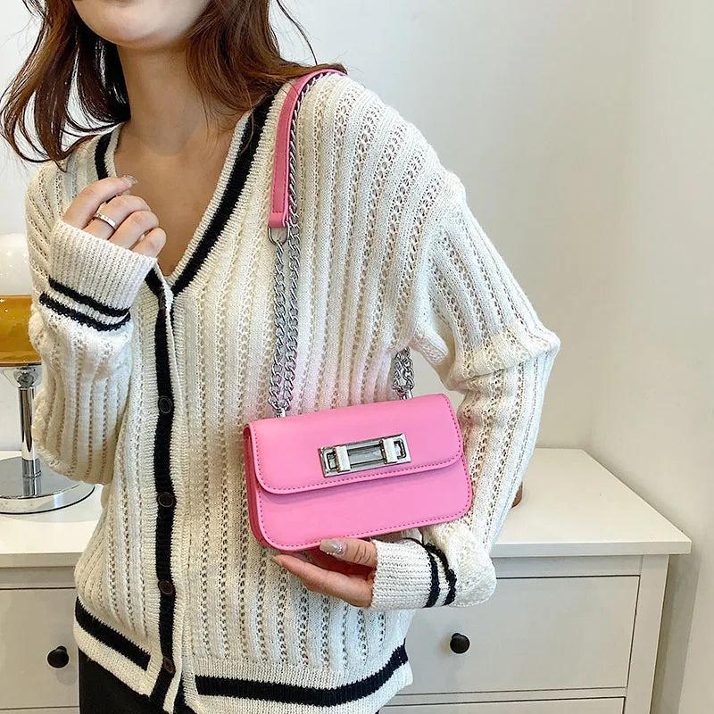 This mini handbag is perfect for carrying your essentials in style. It features a flap design and comes with a chain shoulder strap. The pink and green color combination adds a fun pop of color to your outfit.